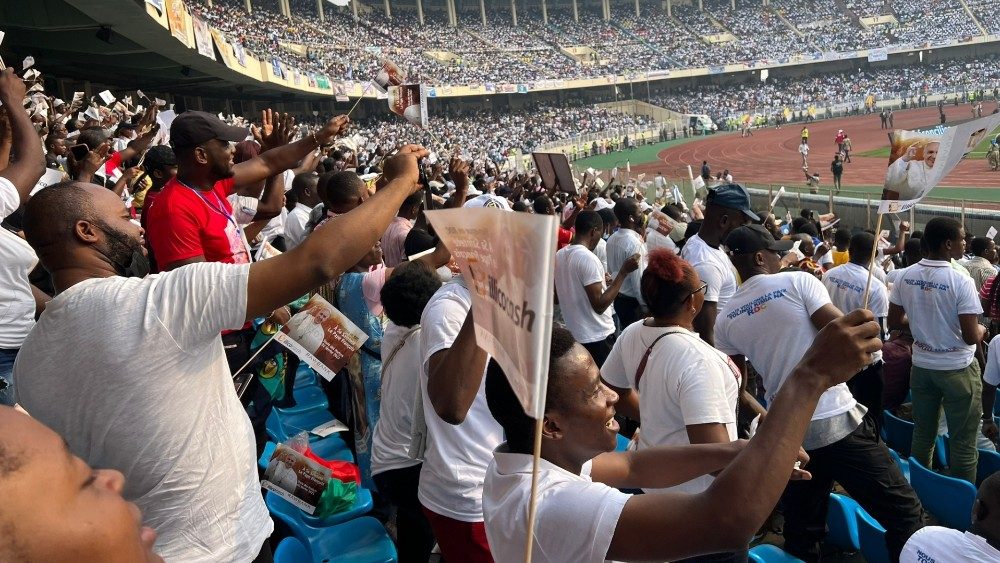 Římského biskupa na stadionu mučedníků v Kinshase, který nese jméno čtyř konžských politiků obviněných z konspirace za diktátora Mobuta, oslavovalo mnoho rukou zvednutých k nebi: více než 65 000 přítomných. Příjezd papamobilu doprovázela hudba, potlesk, bicí nástroje a barevné vlajky. Výbuchy veselí a nakažlivé, nezkrotné radosti se projevovaly písněmi, tanci a tradičními kroji. Jsou to ruce mladých Konžanů, kteří se spolu s katechety konžské církve sešli na dlouho očekávaném setkání: předkládají papeži svůj život, svá očekávání, své problémy, svou touhu po poctivosti a dobrotě. Na některých plakátech psaných italsky je napsáno "Chceme mír v Konžské demokratické republice". František všechny vyzval ke společnému zpěvu a podání ruky sousedním sedícím za vědomí, že jsme jedna církev a že ruce všech jsou nezbytné pro budování míru a jiné budoucnosti Konžské demokratické republiky: