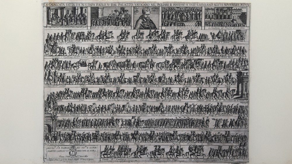 Zdroje podrobně popisují cestu ze svatého Petra do Latránu, například v Codici di Cencio (Liber Censuum Romanae Ecclesiae) z roku 1192, v části Ordo Romanus de consuetudinibus, která shrnuje papežské obřady a ceremonie používané až do počátku 16. století, nebo v Gesta Innocentii III, biografie Inocence III. z let jeho pontifikátu mezi lety 1198 a 1216. Na druhou stranu, působivý pohled se nabízí již na různých tiscích nebo fresce v lunetě Vatikánské apoštolské knihovny: dlouhá hadovitá procesí rozložená, aby se vešla celá, na několik horizontálních registrů. Pod každou skupinou osob je vysvětlení, o koho se jedná: skupiny kardinálů na koních, další představitelé duchovenstva, šlechtici, papežská milice, cizinci, podkoní, komorníci a tak dále. Některé postavy v průběhu času zmizely a jiné se objevily, jako například konzistoriální advokáti přítomní od 17. století.