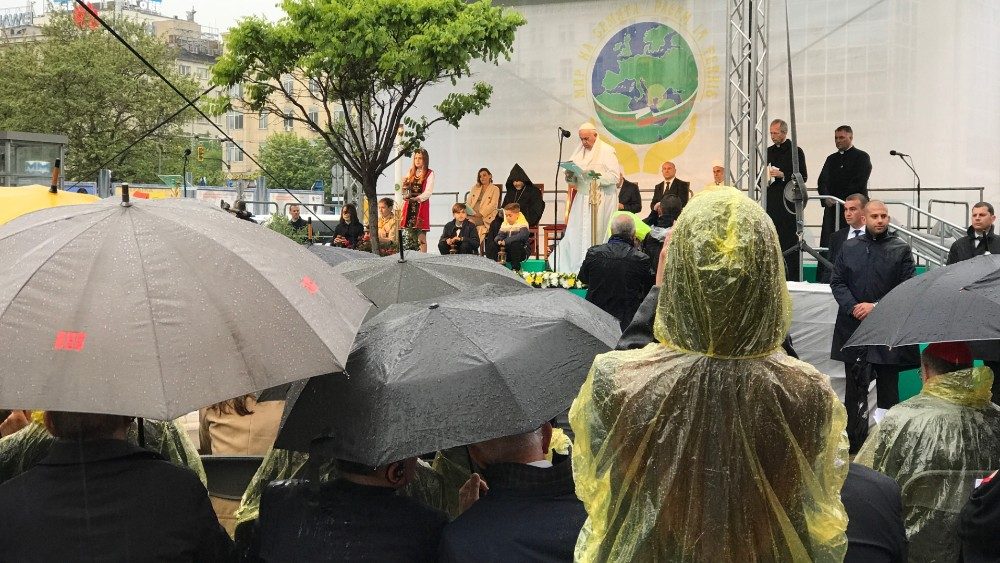 Franziskus kam auch auf den Ort des Friedenstreffens zu sprechen – allerdings ohne den „sozialistischen Realismus“ zu erwähnen. Hier befinde man sich über den Ruinen der antiken Stadt Serdica, und von hier könne man eine orthodoxe, eine armenische und eine katholische Kirche sehen, außerdem eine Moschee und eine Synagoge „unserer älteren Brüder und Schwestern, der Juden“. Mit der letztgenannten Formulierung zitierte er übrigens eine Wendung des heiligen Papstes Johannes Paul II.