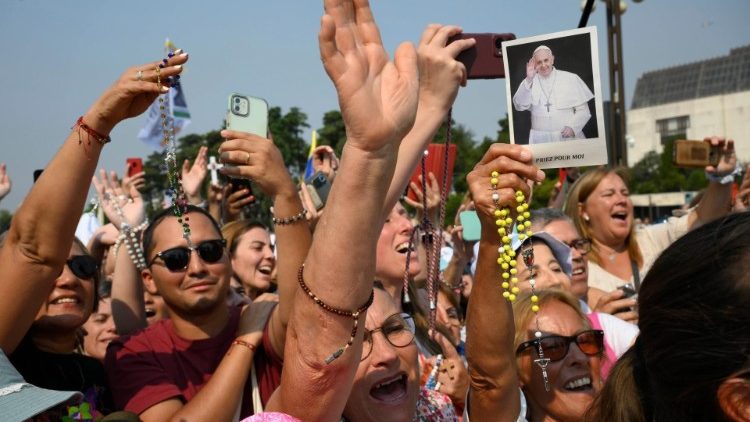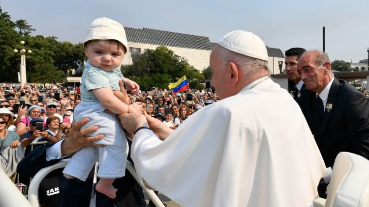 Die Muttergottes ist 1917 in dem portugiesischen Ort drei Hirtenkindern erschienen; Franziskus hat 2013 beim Amtsantritt sein Pontifikat unter den besonderen Schutz Unserer Lieben Frau von Fatima gestellt. Es war schon sein zweiter Besuch in Fatima; 2017 hatte er hier den hundertsten Jahrestag der Erscheinungen begangen. Der Papst hält sich derzeit in Portugal auf, um am 37. katholischen Weltjugendtag (WJT) von Lissabon teilzunehmen. Viele junge Teilnehmende des WJT hatten sich ebenfalls auf den Weg nach Fatima gemacht, ihre Fahnen gaben der Szenerie einen bunten Anstrich.