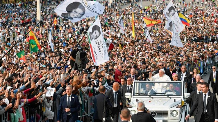 Das Pilgern ist ein marianischer Zug, denn die erste, die sich nach der Verkündigung Jesu auf den Weg gemacht hat, war Maria; sobald sie hörte, dass ihre Kusine - die schon betagt war - schwanger gworden war, ist sie aufgestanden und losgegangen. Sie ging eilig los... mit diesem Wunsch, zu helfen, präsent zu sein. Es gibt so viele Anrufungen an Maria, aber wir könnten ihnen in Gedanken noch eine weitere hinzufügen: die Jungfrau, die schnell aufsteht und losgeht, sobald es ein Problem gibt, sobald wir sie anrufen. Sie zögert nicht, sie kommt, sie beeilt sich. Unsere Liebe Eilige Frau - wie gefällt euch das? Sagen wir es alle zusammen: Unsere Liebe Eilige Frau! Sie beeilt sich, um uns nahe zu sein, sie beeilt sich, weil sie Mutter ist...