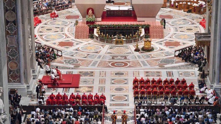 „Komm, Schöpfer Geist“, sangen die Teilnehmenden an der Messfeier in St. Peter; die Pfingstsequenz gehört zu den liturgischen Charakteristika der Feier, die an die Herabkunft des Heiligen Geistes im Abendmahlssaal von Jerusalem erinnert.
