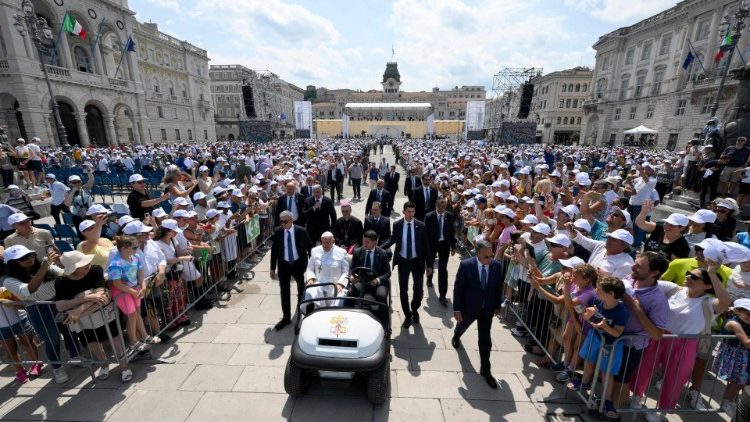 Etwa 8.500 Menschen waren auf die „Piazza dell’Unità d’Italia“, den Platz der Einheit Italiens, gekommen, der direkt ans Meer grenzt. Die neoklassizistischen Prachtbauten rund um diesen größten Platz der norditalienischen Stadt waren ein würdiges Setting für die Messe mit dem Papst, der über Tag aus Rom nach Triest gekommen war.