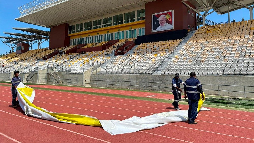 Preckel: Nach dem Ausruhen steht für Franziskus am Samstag der Besuch beim Generalgouverneur an, Stichwort weißer Stuhl mit Blick über die Bucht, danach geht’s runter ins schicke Konferenzgebäude APEC-Haus, wo er sich an Vertreter der Behörden, der Politik, der Zivilgesellschaft wendet. Am Samstagnachmittag Ortszeit, für unsere Hörer und Zuschauer ist das Programm zeitlich Freitagnacht beziehungsweise Samstagmorgen, trifft sich Franziskus an einer Schule mit Straßenkindern und Kindern mit Behinderung, die ihm ihre Geschichte erzählen werden. Danach begegnet er im Marienheiligtum, also am Sitz des Erzbistums von Port Moresby, den auch Johannes Paul II. 1984 besuchte, Kirchenvertretern aus dem ganzen Land und von den Solomonischen Inseln. Wir haben es hier ja geografisch mit Inselstaaten zu tun, das heißt man reist teilweise auch mit Boot an. Sonntag gibt es die große Messe im Stadion von Port Moresby, wo vorgestern noch schnell die Treppe weiß gestrichen und die Choreographie einstudiert wurde, danach reist der Papst für einen halben Tag nach Vanimo Richtung Norden an der Grenze zum indonesischen Teil Neuguineas. Am Montag, dem letzten Reisetag in Papua-Neuguinea, steht ein Jugendtreffen auf dem Programm, nochmal im Stadion der Hauptstadt.