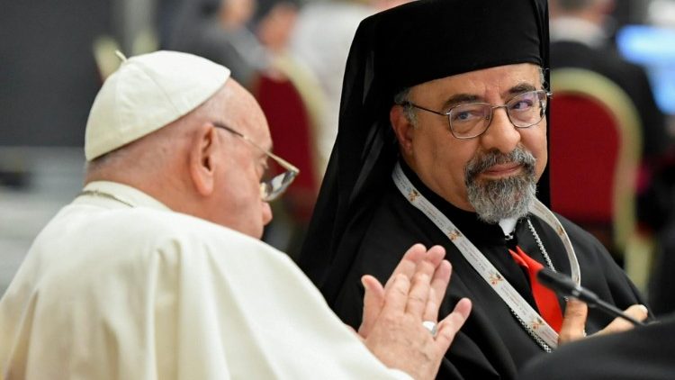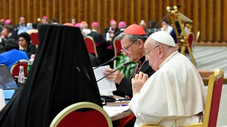 Meine Aufgabe ist es, wie ihr wisst, die Eintracht zu bewahren und zu fördern – wie uns der heilige Basilius lehrt – die Harmonie, die der Heilige Geist weiterhin in der Kirche Gottes und in den Beziehungen zwischen den Kirchen verbreitet, trotz aller Mühen, Spannungen und Spaltungen, die ihren Weg bis zum vollen Offenbarwerden des Reiches Gottes kennzeichnen, das wir uns gemäß der Vision des Propheten Jesaja als ein von Gott für alle Völker bereitetes Festmahl vorstellen dürfen. Alle, in der Hoffnung, dass niemand fehlen wird. Alle, alle, alle! Niemand ausgeschlossen, alle. Und das Schlüsselwort ist: Harmonie. Was der Geist tut, die erste starke Manifestation, am Pfingstmorgen, ist die Harmonisierung all dieser Unterschiede, all dieser Sprachen... Harmonie. Das ist das, was das Zweite Vatikanische Konzil lehrt, wenn es sagt, dass die Kirche „gleichsam Sakrament“ ist: Sie ist ein Zeichen und Werkzeug der Erwartung Gottes, der den Tisch bereits gedeckt hat und wartet. Seine Gnade flüstert durch seinen Geist in das Herz eines jeden Worte der Liebe ein. Uns ist es aufgegeben, dieses Flüstern zu verstärken, ohne es zu behindern; Türen zu öffnen, ohne Mauern zu errichten. Was für ein Unheil richten die Frauen und Männer der Kirche an, wenn sie Mauern errichten, was für ein Unheil! Alle, alle, alle! Wir dürfen uns nicht wie „Gnadenspender“ verhalten, die sich den Schatz aneignen, indem sie dem barmherzigen Gott die Hände binden. Erinnert euch daran, dass wir diese Synodenversammlung damit begonnen haben, um Vergebung zu bitten, uns zu schämen und anzuerkennen, dass uns allen Barmherzigkeit zuteilgeworden ist.
