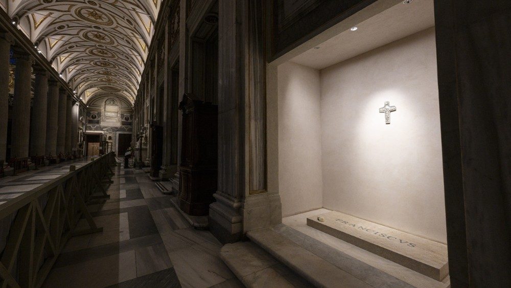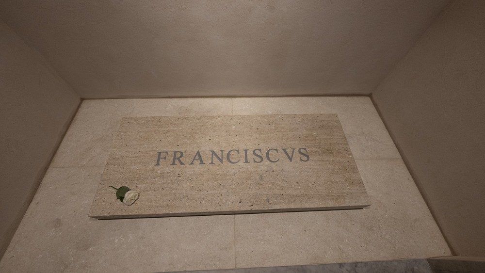 Wie auch schon bei der Aufbahrung im Petersdom zieht sich ein konstanter Menschenstrom durch die Kirche, eine kleine Traube bildet sich an der Stelle, wo sich die schlichte weiße Grabplatte befindet. Nach Wunsch des verstorbenen Papstes findet sich auf ihr nur ein Wort, Franziskus. Von oben strahlt ein einzelner Scheinwerfer den Schriftzug an. An der Wand über der Grabplatte ist ein Kreuz eingelassen, dass dem Brustkreuz nachempfunden ist, das Franziskus sowohl als Bischof als auch als Papst getragen hatte.