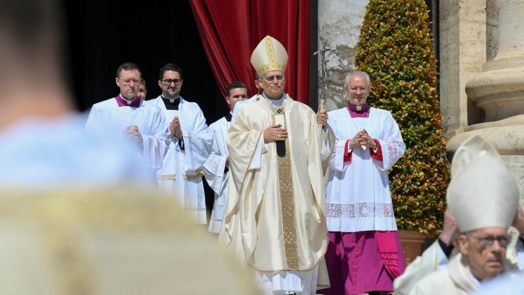 Abschließend erinnerte Leo XIV. noch an all jene, die „uns bereits in sein ewiges österliches Licht vorausgegangen sind“ – Eltern, Großeltern, Geschwister, Kinder. „Das Gebet des Sohnes Gottes, das uns auf unserem Weg Hoffnung schenkt, erinnert uns auch daran, dass wir eines Tages alle uno unum sein werden: eins in dem einzigen Erlöser, umfangen von der ewigen Liebe Gottes,“ schloss die Predigt des Papstes, der dem Augustinerorden angehört und dessen Wappen den Wahlspruch trägt: In Illo uno unum (In dem Einen sind wir eins).
