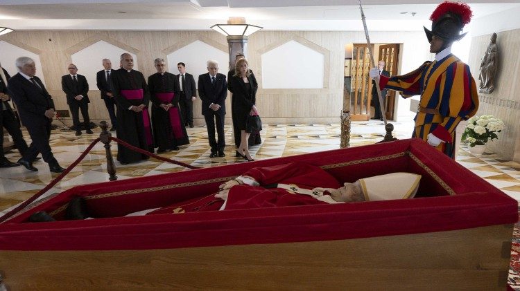Den Tod von Papst Franziskus stellte am Morgen des Ostermontag zunächst ein Arzt medizinisch fest. Am Abend folgte in der Kapelle der Casa Santa Marta, der Residenz von Papst Franziskus, die rituelle kirchliche Todesfeststellung. Danach wurde die sterbliche Hülle in den Sarg gelegt, in dem er bestattet wird. Der Leichnam des verstorbenen Papstes trägt die Bischofsmütze und ein rotes Messgewand, in den Händen einen Rosenkranz.