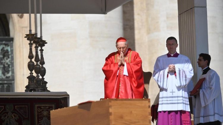 Das Requiem wurde von Kardinal Giovanni Battista Re zelebriert, dem 91-jährigen Dekan des Kardinalskollegiums. Über Rom spannte sich ein herrlich blauer Himmel, doch herrschten rund um den Vatikan scharfe Sicherheitsvorkehrungen. Wer bei der Totenmesse dabeisein wollte, der musste früh aufstehen und viele Kontrollen in Kauf nehmen. Liturgische Farbe auf dem Petersplatz war österliches Rot; auf der Fassade des Petersdoms war eine große Teppich-Darstellung des auferstandenen Christus angebracht. Mit Re konzelebrierten 224 Kardinäle, 750 Bischöfe und viele Priester.