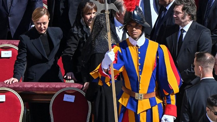 Delegationen aus etwa 130 Staaten, darunter zwölf gekrönte Häupter, waren auf der Piazza präsent. Die Liste der anwesenden 52 Staatschefs und zahlreichen Regierungschefs liest sich wie ein „Who is who“ der internationalen Politik, von Donald Trump (USA) über Javier Milei (aus der argentinischen Heimat des Verstorbenen) und Wolodymyr Selenskyj (Ukraine) bis zu Frank-Walter Steinmeier (Deutschland). Allerdings fehlten einige bekannte Namen, etwa der russische Präsident Wladimir Putin oder Israels Regierungschef Benjamin Netanjahu.