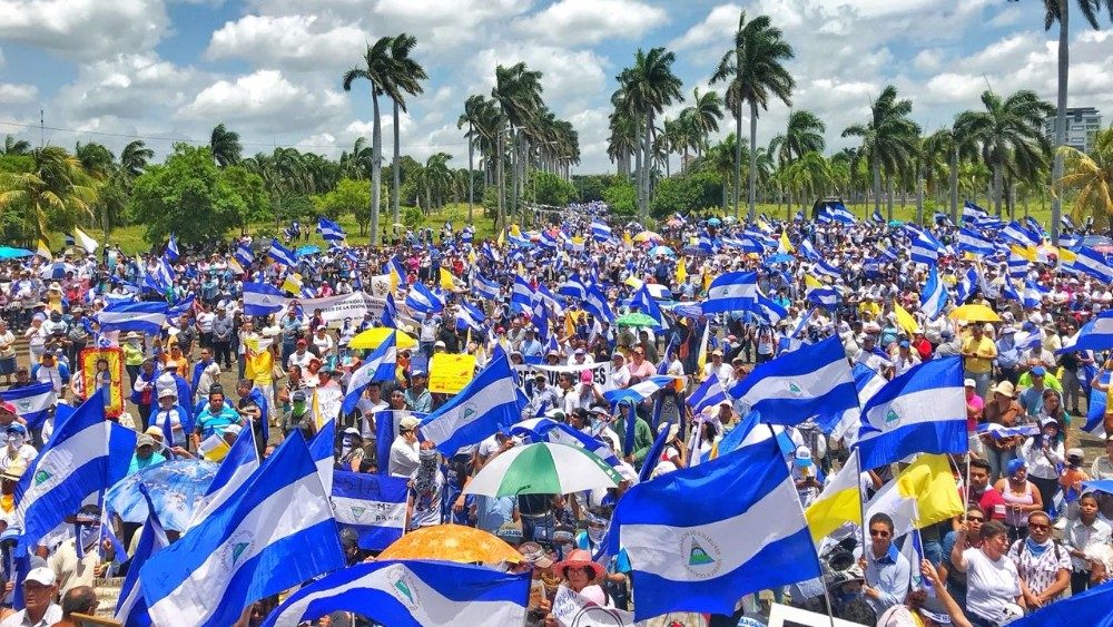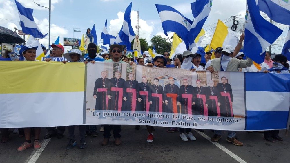 Al son de marimbas con banderas azul y blanco de Nicaragua y blanco y amarillo de la Iglesia, con rosarios en mano, la población de Managua peregrinó en apoyo a los Obispos de la Conferencia Episcopal de Nicaragua.