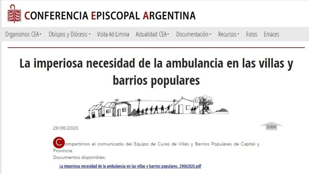 A través de un comunicado firmado por el Equipo de sacerdotes de Villas y Barrios Populares del llamado “AMBA” (ciudad de Buenos Aires y Conurbano), incluido el obispo auxiliar de Buenos Aires, Gustavo Carrara; los conocidos como Curas Villeros de Argentina, que comparten la vida con los vecinos pobres de las villas, denuncian que desde hace décadas, "el servicio de emergencias médicas es insuficiente y hasta deficiente".