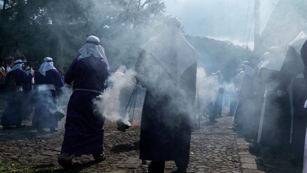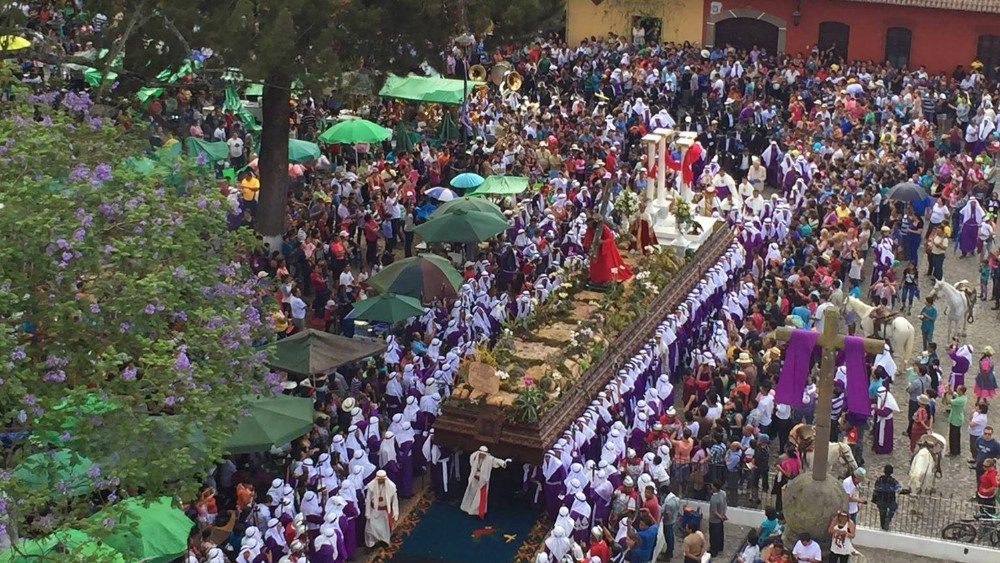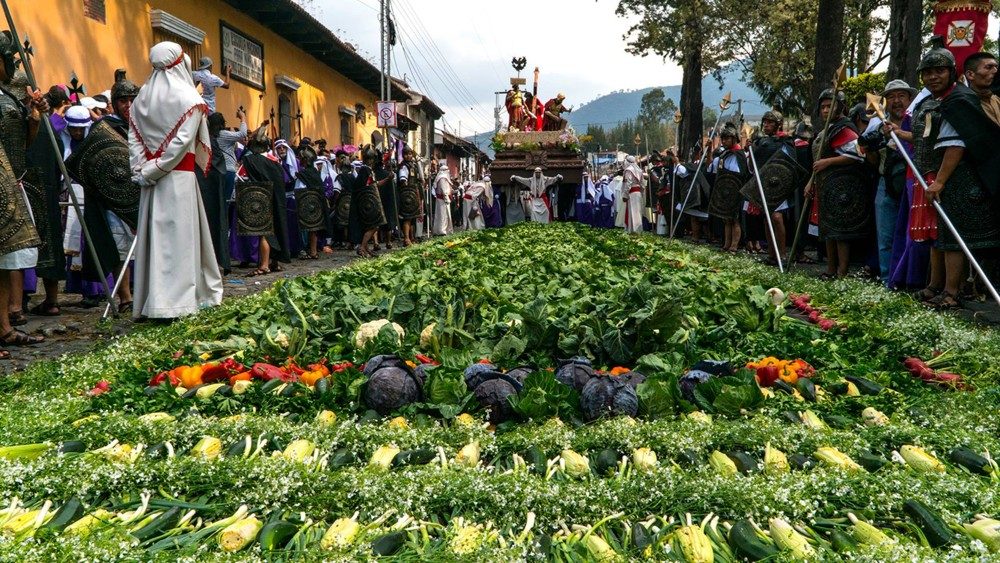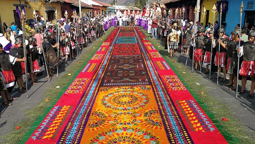 Además, las procesiones en Guatemala son caracterizadas por las alfombras que adornan las calles en donde son llevadas en hombros por períodos de hasta dieciocho horas de duración, las imágenes que representan la Pasión de Jesús. Las alfombras son elaboradas representando figuras folclóricas y religiosas. Estas artesanías son realizadas con aserrín de colores, flor de corozo, rosas, hojas de palma y otros materiales orgánicos.
