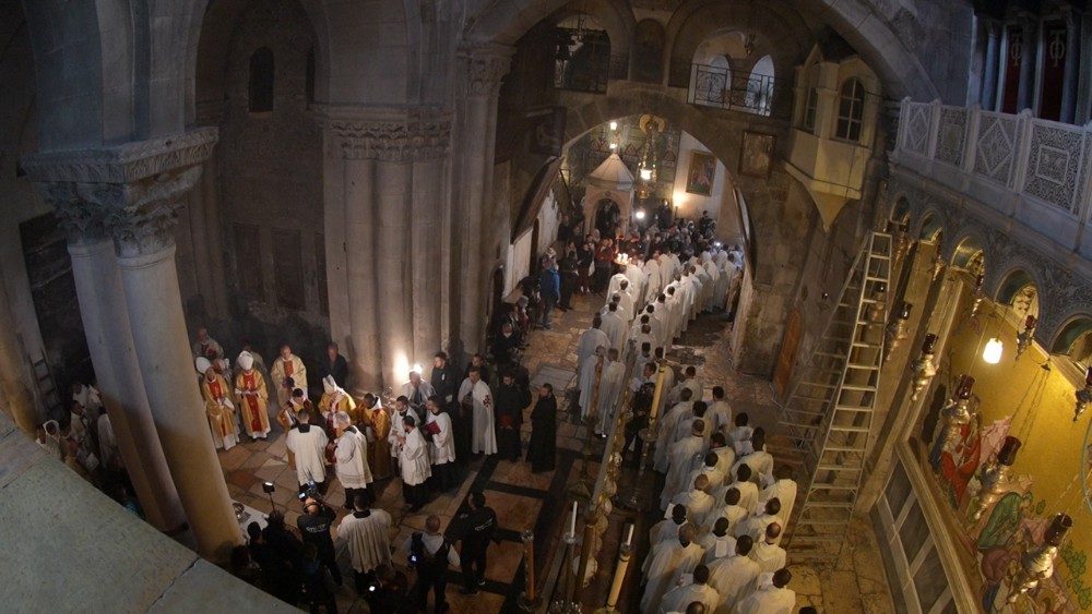 Dopo gli scontri di ieri nella Spianata delle Mosche, la notte è passata tranquilla. Nei vicoli della città vecchia gli ebrei di ritorno dal Kotel si incrociano con i kawass, le famose e colorate guardie d’onore delle Chiese di Terrasanta che fanno strada al Patriarca di Gerusalemme dei Latini Pierbattista Pizzaballa. Ad attenderlo nella piazzetta del Santo Sepolcro ci sono centinaia di fedeli e pellegrini, finalmente tornati nei luoghi Santi, dopo due anni di pandemia. Il grande portone di legno della Basilica è socchiuso, perché la benedizione del fuoco, primo rito della lunga Veglia pasquale, avviene davanti alla pietra dell’unzione, ai piedi del Calvario.