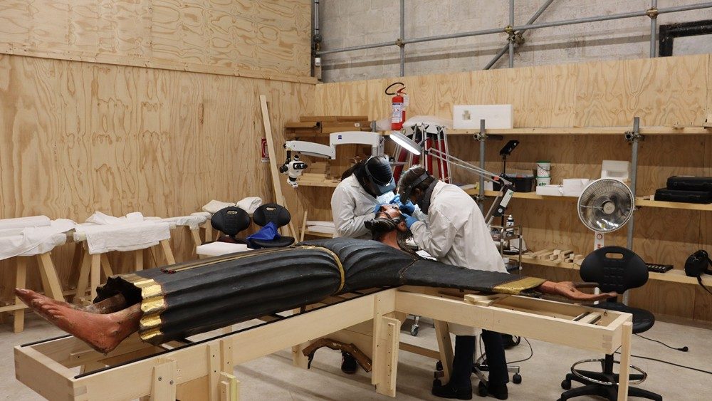 Da due anni, esattamente dal 1° dicembre 2022, si trova nel laboratorio allestito nel transetto nord della cattedrale di San Martino, affidato alle cure dei restauratori; i visitatori possono assistere alle varie fasi degli interventi da dietro un vetro. Vederlo disteso, ad altezza d’uomo, spinge a un forte sentimento di tenerezza: è come se il Crocifisso fosse tornato Bambino nella culla del Natale.