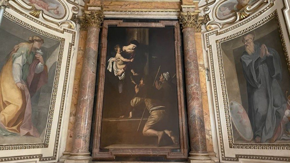 “È l’ultima opera romana di Caravaggio. La famiglia Cavalletti era originaria delle Marche e devota alla Madonna di Loreto. La Vergine è rappresentata di fronte alla Santa Casa appena tratteggiata con un gradino e uno stipite un po’ sberciato. Non abita in una casa nobile. Il panno bianco con cui sorregge il Bambino è un riferimento al sudario della Passione”. Il messaggio di quest’opera è proprio della spiritualità agostiniana. “Il movimento verso Dio”, fa notare padre Cormio, “non avviene solo tramite la volontà dell’uomo. C’è sempre la grazia divina che ci precede e viene incontro”