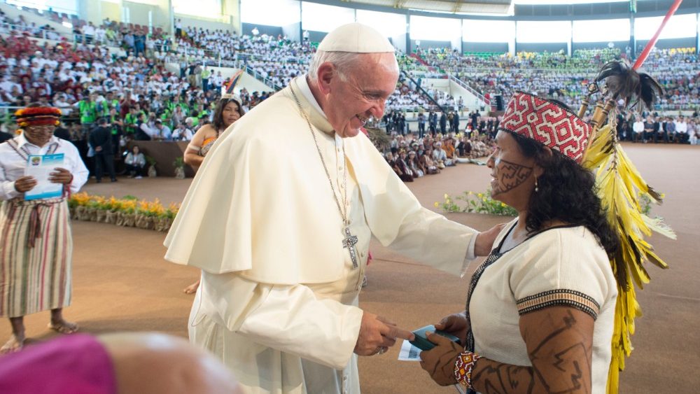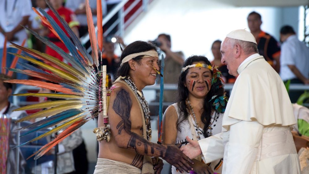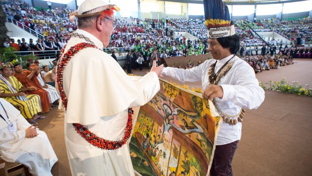 Poco prima, il Papa aveva chiesto alle autorità politiche ed ecclesiastiche degli Stati amazzonici di “compiere sforzi per dar vita a spazi istituzionali di rispetto, riconoscimento e dialogo con i popoli nativi; assumendo e riscattando cultura, lingua, tradizioni, diritti e spiritualità che sono loro propri”. E riferendosi alla Chiesa locale, il Pontefice conclude sottolineando che “abbiamo bisogno che i popoli originari plasmino culturalmente le Chiese locali amazzoniche”. Ricorda di aver ascoltato con gioia “che uno dei brani della Laudato si’ è stato letto da un diacono permanente della vostra cultura. Aiutate i vostri Vescovi, aiutate i vostri missionari e le vostre missionarie affinché si uniscano a voi, e in questo modo, dialogando con tutti, possano plasmare una Chiesa con un volto Amazzonico e una Chiesa con un volto indigeno”.