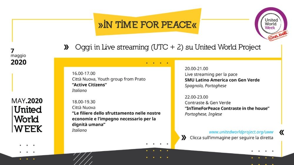 La Settimana Mondo Unito si svolge dal 1 al 7 maggio di ogni anno, e questa volta si è tenuta tutta in versione on line, a causa dell’epidemia del Covid-19, con l'aggiunta di un giorno in più. L'evento è trasmesso dal sito web www.unitedworldproject.org e attraverso i social collegati, così per giovani e adulti di circa 70 Paesi è stato possibile seguire, momento per momento, ciò che stava avvenendo in Italia, o negli Usa, in Australia o nella Repubblica Democratica del Congo e ancora a Concepcion in Cile, a Ho chi Minh in Vietnam, a Vancouver in Canada, in varie regioni della Nigeria, a Prienai in Lituania, fino a Seúl in Corea. Lanciata dai giovani del Movimento dei Focolari nel maggio del 1995, l’iniziativa vede la partecipazione di tanti altri movimenti, associazioni, istituzioni, comunità che operano per la pace e la fraternità fra i popoli.