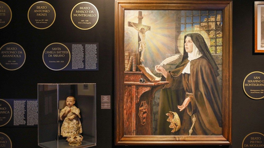 Pizzo passa a parlare di uno dei due aspetti fondanti della mostra in corso a Castel Sant’Angelo: “I santi specifici delle Marche non sono solo appartenenti agli ordini mendicanti, ma anche esponenti di una visione mistica, quasi eremitica della Chiesa. Inoltre la scrittura femminile di Santa Camilla Battista da Varano, Santa Veronica Giuliani, rappresentano delle accezioni particolarissime non solo per la scrittura femminile, ma anche per il modo di intendere il ruolo e la presenza femminile all'interno della Chiesa”. I santi passano attraverso un arco temporale che va da San Marcellino e giunge a Santa Maria Goretti. “Sono i due estremi, il primo un santo martire dei primi secoli del cristianesimo, e qui in mostra abbiamo avuto la fortuna di esporre una cosa meravigliosa che sono le pagine dell'Evangelo del VI secolo che secondo la tradizione il santo martire usò per spegnere un incendio, tant'è, che tutto venne bruciato, solo l'Evangelo si salvò. Questi altri sono documenti in pergamena meravigliosi, così come tanti ex-voto, tanti reliquiari come quello di San Gualtiero del 1403, capolavori dell'arte gotica, ma sono anche delle sintesi spirituali e dogmatiche”. “E tutto questo – continua Pizzo - viene raccontato per exempla, cioè per immagini, per documenti, per materiali e reliquie, spesso pochissimo note, pochissimo viste. E questo secondo me è un valore aggiunto anche per l’imminente Giubileo, ovvero mettere un confronto con un territorio attraverso delle cose spesso poco visibili e poco note”.
