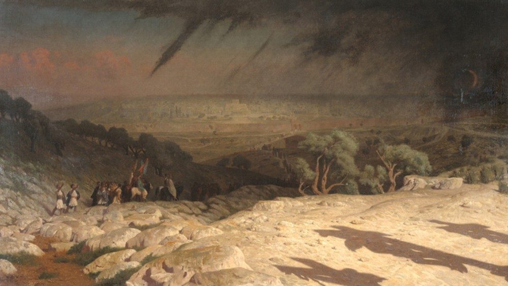 Il cielo si sta facendo cupo, spinge via le nuvole rosate, mentre dall’orizzonte e da destra si fa largo una cappa scura. Stanno arrivando le tenebre. Di lì a poco un terremoto scuoterà la terra e il velo del tempio si squarcerà da cima a fondo.
