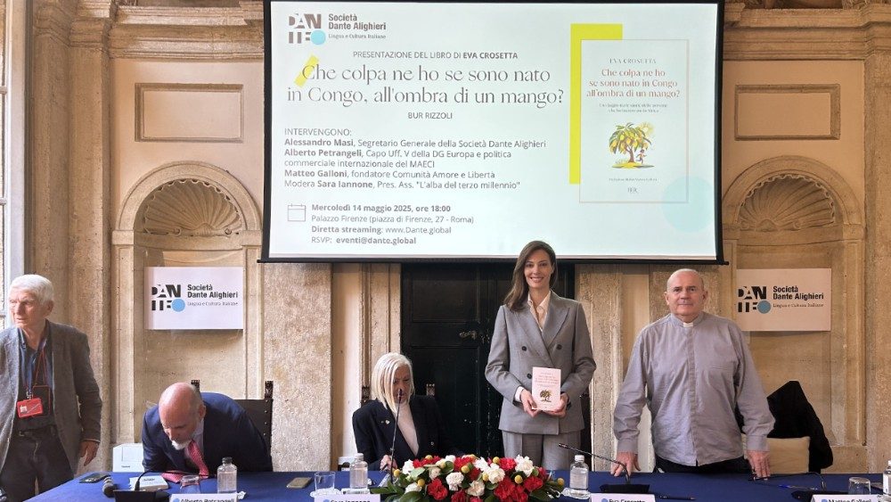 Nella sede romana della Società Dante Alighieri, a Palazzo Firenze, Eva Crosetta ha presentato il 14 maggio il suo libro "Che colpa ne ho se sono nato in Congo all'ombra di un mango? Un viaggio tra le storie delle persone che ho incontrato in Africa". Presente don Matteo Galloni, fondatore della Comunità "Amore e Libertà", la cui strada si è incrociata con quella dell'autrice determinando nella sua vita un significativo percorso interiore e un'esperienza profonda