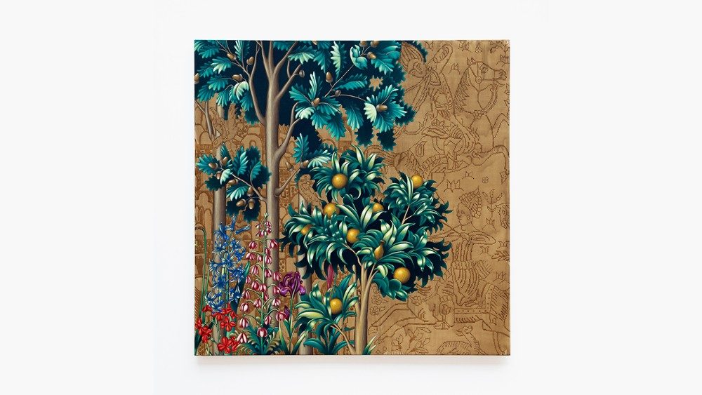 Nella sezione dedicata al giardino si trova l’opera dell’artista palestinese Rayan Yasmine, creata appositamente per l’esposizione. L’artista, di doppia origine – padre cristiano e madre musulmana sciita – ha realizzato un’Annunciazione che “riunisce doppie origini in una sintesi che dialoga con il primo Rinascimento italiano e con la tradizione sciita, attraverso tessuti e motivi che evocano la cultura mediterranea".