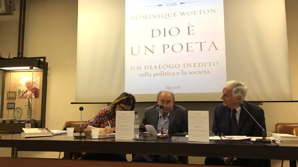 Francesco non è "il Papa del popolo, ma vuol essere il Papa di tutti”. Non è di sinistra, ma “è in collera contro le follie del mondo, le ingiustizie, gli egoismi, le fabbriche e i commercianti di armi. Ha una grande fiducia nelle persone semplici e meno nelle élites”. Dominque Wolton, settantenne sociologo e teorico della comunicazione francese, descrive così, ai giornalisti in Sala Marconi di Palazzo Pio, il Papa che ha incontrato ben dodici volte, tra il febbraio del 2016 e del 2017. Da questi colloqui, più di un ora ciascuno, ha tratto un libro di 250 pagine uscito nell’edizione francese nel settembre 2017 col titolo “Politique et société” e dal 24 aprile nelle librerie italiane come “Dio è un poeta”.