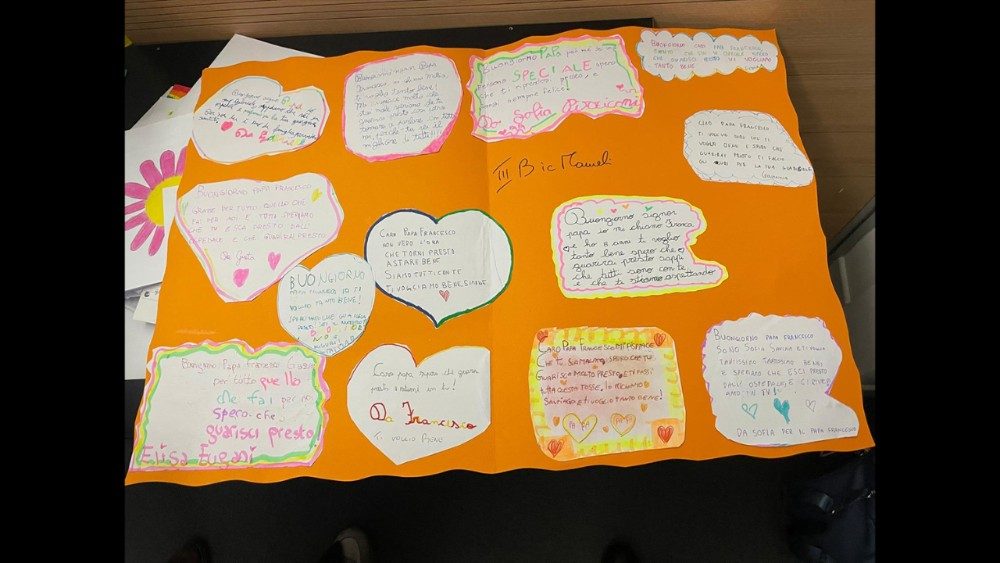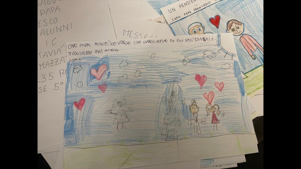 Nella giornata di oggi dal suo account @Pontifex in nove lingue il Papa – mai più apparso in pubblico dal 14 febbraio, giorno del ricovero – ha voluto inviare un messaggio per esprimere gratitudine a quanti in questi giorni hanno fatto recapitare al Gemelli “messaggi di affetto”: “Grazie per questa vicinanza e per le preghiere di conforto che ho ricevuto da tutto il mondo!”, si legge nel post. In particolare Jorge Mario Bergoglio si è detto “particolarmente colpito” dalle lettere e dai disegni inviatigli dai bambini. Tantissimi i messaggi, infatti, che numerosi piccoli di diverse scuole italiane hanno fatto recapitare al Policlinico. Biglietti, lettere e, soprattutto, disegni. Disegni di ogni genere: cuori, fiori, post raccolti in un unico cartone, la figura dello stesso Francesco mentre apre la Porta Santa del Giubileo o cammina accanto ai più giovani. Tutti sono accompagnati da frasi di sostegno: “Caro Papa Francesco, spero che torni presto a stare bene!”, “Ti voglio bene, spero che guarisci presto”, “Buongiorno… spero tanto che guarisca. Sei il numero 1”.