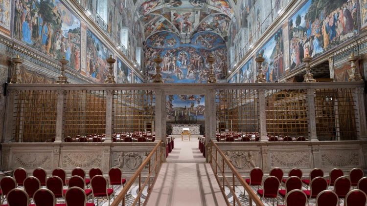 Le immagini dei media vaticani con la Cappella michelangiolesca allestita per accogliere i cardinali che da domani, 7 maggio, si riuniranno per eleggere il nuovo Romano Pontefice. Allestita anche la cosiddetta "Stanza delle Lacrime", dove il Papa neo eletto indosserà per la prima volta la talare bianca