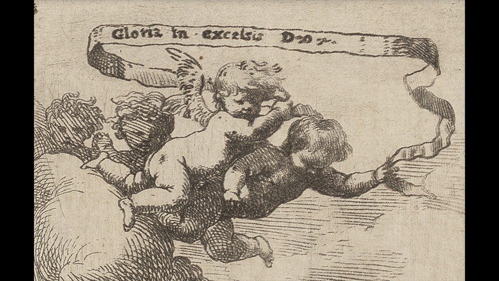 Tra queste si distingue una Natività con angeli adoranti, acquaforte che risale al 1650 circa, dove Gesù bambino è al centro della raffigurazione, intima e raccolta, con Maria, Giuseppe e due angeli in adorazione. In alto gli angeli cantano il Gloria, mentre sullo sfondo le rovine classiche  alludono  al passaggio dal vecchio mondo pagano a quello cristiano.