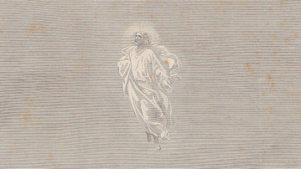 L’episodio è illustrato da una xilografia incisa da Ligny su disegno di Gustave Doré, noto illustratore, disegnatore e incisore francese. È conosciuto soprattutto per le sue immagini della Divina Commedia di Dante. Apprezzato artista di tematiche religiose è celebre anche per la sua edizione illustrata della Sacra Bibbia che larga influenza ebbe nell’arte religiosa dall’Ottocento e da cui è tratta questa incisione. Cristo è avvolto da una luce fortissima che sembra emanata dal suo stesso corpo. In primo piano sono raffigurati gli apostoli, disposti in due gruppi: contemplano l’evento con sguardi rapiti e concitati gesti di stupore. Il pathos caratterizza questa tavola che suscita in chi la guarda forti emozioni e offre un’impressione di ieraticità tesa e solenne.