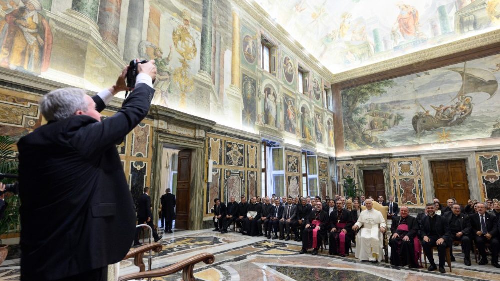 Francesco ha fatto della sua macchina fotografica uno strumento di comunione. Ha raccontato con le immagini l’essenza del ministero petrino: la prossimità, l’incontro, l’abbraccio, l’incontro degli sguardi. Penso alle foto a Regina Coeli, all’abbraccio di Francesco con i detenuti. O le foto con i bambini e rifugiati nel campo profughi di Lesbo. Penso alle foto in Iraq o in Canada; a quella della donna anziana che stava con un cartello a Panama: anche noi sappiamo fare chiasso.