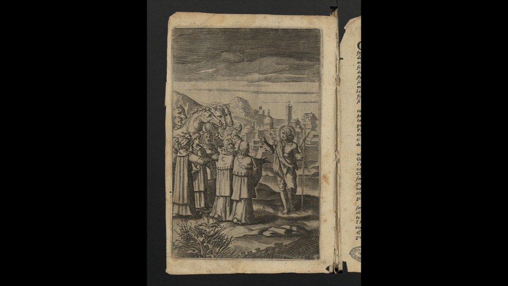 Il racconto evangelico è illustrato dall’incisore Camillo Cungi in due scene. Quella in primo piano, identificata con la lettera A, rappresenta il santo interrogato dai sacerdoti e dai leviti inviati dai Giudei (Gv, 1,19-28). Postagli la domanda «Tu, chi sei?», egli confessò «Io non sono il Cristo» e quando gli chiesero «Chi sei, dunque? Sei tu Elia?», rispose «Non lo sono» e negò anche di essere un altro profeta. All’ennesima richiesta su chi fosse, affermò «Io sono voce di uno che grida nel deserto: Rendete diritta la via del Signore, come disse il profeta Isaia».
