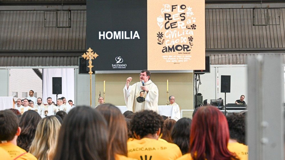 O padre Rafael Galvão, responsável pela Pastoral Vocacional dos Salesianos, acolheu os jovens e ofereceu a Santa Missa, que foi a primeira atividade do evento, para a juventude que não conhece a “civilização do amor”, tema do Festival deste ano. A Santa Missa, presidida pelo inspetor da Inspetoria Nossa Senhora Auxiliadora, padre Justo Ernesto Piccinini, começou com um minuto de silêncio pelas vidas perdidas na Guerra da Ucrânia e no conflito entre Israel e Hamas.