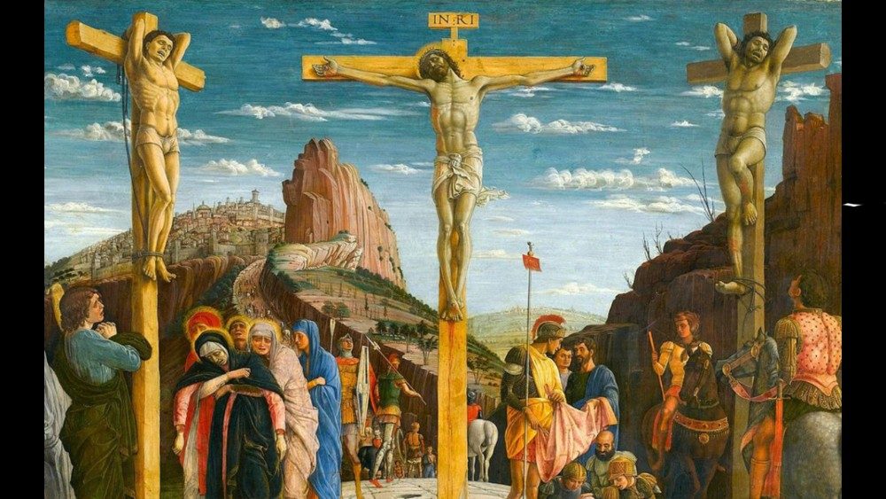 A sombra de Cristo na pintura não testemunha uma ausência, não torna menos dramática a iconografia usual do rosto doloroso gotejando sangue, das mãos e dos pés pregados, do lado ferido; em vez disso, fala perfeitamente às consciências e as sacode até o âmago, faz com que nos sintamos fisicamente presentes sob as três cruzes. A alusão se torna mais real do que a representação e nos leva a buscar novos significados, novas razões.
