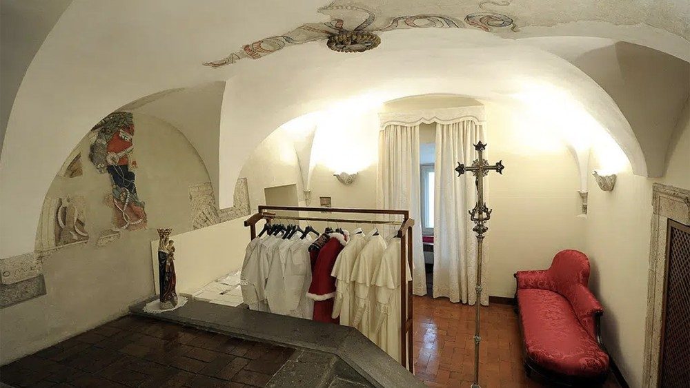 Depois da verdade feita arte dos afrescos da Sistina, seu esplendor deslumbrante e absoluto, a luz e o ouro, o gigantismo das figuras, com olhos que parecem brilhar, com gestos capazes, por si sós, de evocar passagens precisas das Escrituras, ficamos consternados ao cruzar o limiar da porta que leva à “Sala das Lágrimas”. Deixamos para trás a magnificência universalmente aclamada das pinturas de Michelangelo e dos maiores artistas renascentistas para nos encontrarmos em uma sala pequena e sem cor. É uma sala com abóbadas com lunetas nas quais estão preservados alguns fragmentos de afrescos. Dois lances de escada em um lado e, na parede oposta, uma janela escondida por uma cortina. Uma mesa e duas cadeiras de madeira escura, um sofá vermelho e um cabideiro. A decoração é essencial. A maravilha sentida ao ver a beleza absoluta dá lugar a um sentimento íntimo que se expande na alma, à percepção da passagem dos séculos: parece se estar vendo os Pontífices escolhendo uma das três batinas brancas disponibilizadas a eles, cada uma de um tamanho diferente, e de estar vestindo aquela que será a roupa e a cor que os distinguirão para sempre. É algo mais antigo e profundo do que uma simples troca de roupa. A tradição e o ritual assumem um significado poderoso que não é apenas formal, mas, acima de tudo, espiritual.