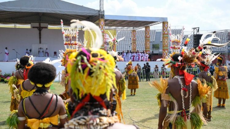 Poviem vám jednu vec: som šťastný z týchto dní strávených vo vašej krajine, kde spolunažívajú more, hory a tropické pralesy, ale predovšetkým je to mladá krajina obývaná mnohými mladými ľuďmi! A mladú tvár krajiny sme mohli všetci kontemplovať aj prostredníctvom krásneho predstavenia, ktoré sme tu videli. Ďakujeme vám! Ďakujem vám za vašu radosť, za spôsob, akým ste rozprávali o kráse Papuy, „kde sa oceán stretáva s nebom, kde sa rodia sny a vznikajú výzvy“ a predovšetkým vám ďakujem, pretože ste všetkým vyslovili dôležité želanie: „čeliť budúcnosti s úsmevmi nádeje!“ S úsmevmi radosti.