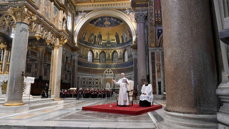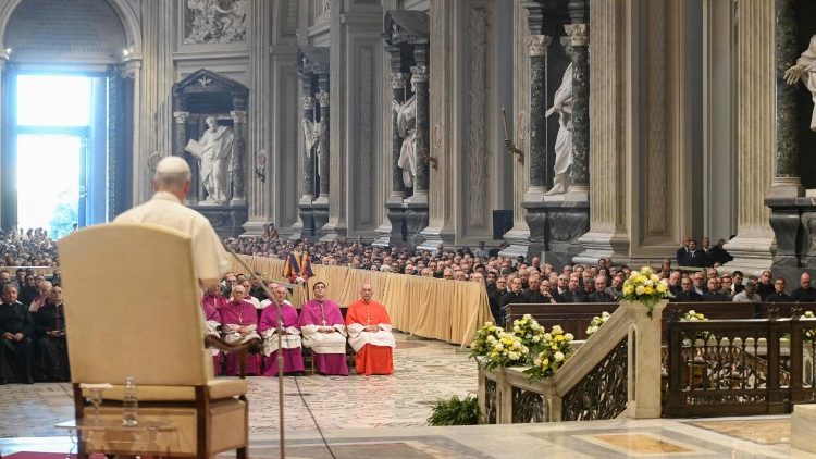 je pre mňa radosť byť s vami v Katedrále Ríma: pápež je pápežom preto, že je biskupom Ríma, a ja som s vami kresťanom a pre vás biskupom. Ďakujem kardinálovi vikárovi za slová, ktorými uviedol toto stretnutie, ktoré vnímam ako veľké objatie biskupa so svojím ľudom.