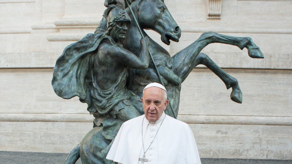 Na archívnej snímke z 15. apríla 2015 je pápež František pred súsoším sv. Juraja po jeho požehnaní vo Vatikáne. Súsošie bolo určené pre námestie v juhotalianskom meste Airola v provincii Benevento. Zemetrasenie v roku 1980 tu narušilo statiku starobylého Kostola sv. Juraja, ktorý bol následne zbúraný.