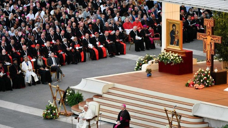 Zato, bratje in sestre, v skupni molitvi prosimo, da bi se ponovno naučili biti tiho: da bi slišali Očetov glas, Jezusov klic in vzdihe Duha. Prosimo, da bi bila sinoda kairós bratstva; prostor, kjer bo Sveti Duh očistil Cerkev govoric, ideologij in polarizacij. Medtem ko se bližamo pomembni obletnici velikega nicejskega koncila, prosimo, da bi znali kot trije modri združeni in v tišini častiti skrivnost Boga, ki je postal človek; prepričani, da bomo, bližje ko bomo Kristusu, tudi bolj povezani med seboj. In kakor je modre z Vzhoda v Betlehem privedla zvezda, tako naj nas nebeška luč vodi k našemu edinemu Gospodu in k enosti, za katero je On molil. Bratje in sestre, odpravimo se skupaj na pot, v želji, da bi ga srečali, častili in oznanjali, »da bi svet veroval« (Jn 17,21).