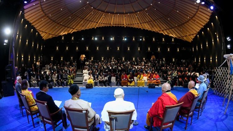 Sveti oče se je na zbrane obrnil »kot brat vernikov v veri v Kristusa in kot brat vseh vas, v imenu skupnega verskega iskanja in pripadnosti istemu človeštvu«. »Človeštvo v svojem verskem hrepenenju lahko primerjamo s skupnostjo popotnikov, ki hodijo po zemlji s pogledom, uprtim v nebo,« je dejal. Nebo v Mongoliji, tako jasno in modro, pa objema prostrano in mogočno zemljo, kar spominja na dve temeljni razsežnosti človeškega življenja: »zemeljsko, ki jo sestavljajo odnosi z drugimi, in nebeško, ki jo sestavlja iskanje Drugega, ki nas presega«. »Mongolija nas spominja na to, da moramo vsi mi, romarji in popotniki, pogled usmeriti navzgor, da bi našli svojo smer na zemeljski poti.«
