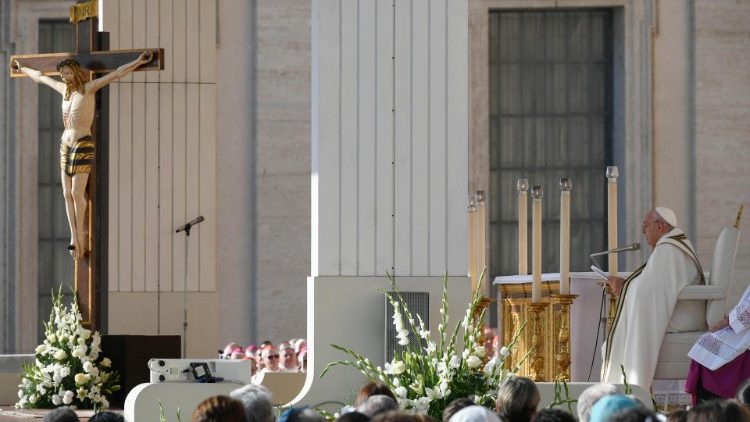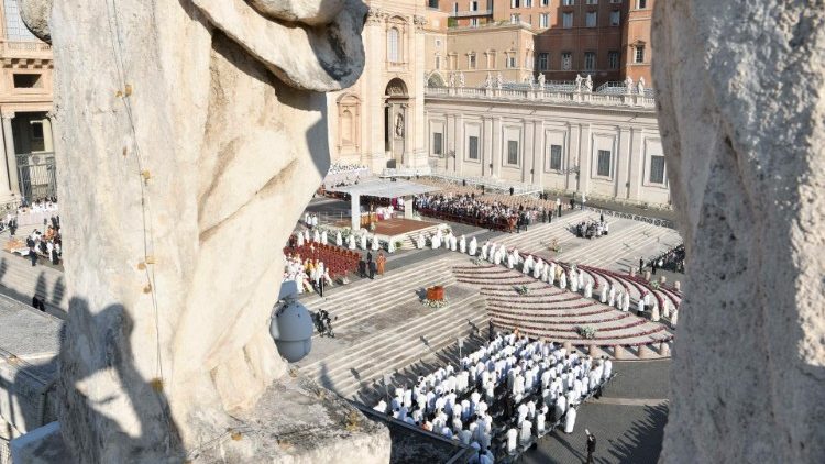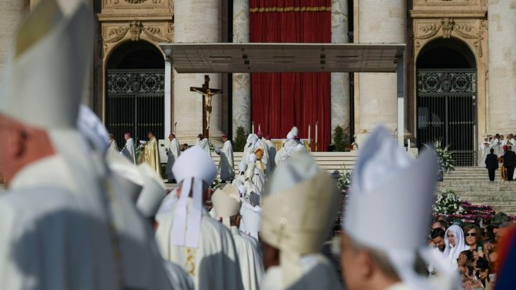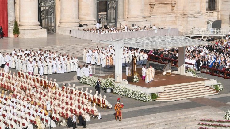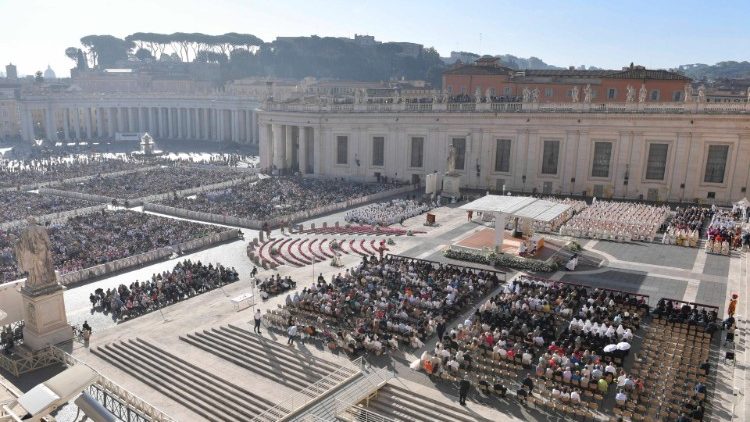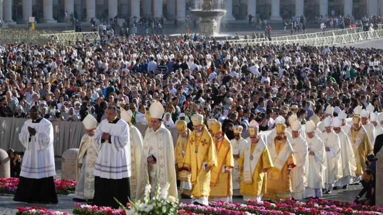 »Poglavitna naloga sinode je ponovno usmeriti pogled na Boga, da bi postali Cerkev, ki na človeštvo gleda z usmiljenjem,« je dejal papež med mašo, s katero se je začelo XVI. redno generalno zasedanje škofovske sinode, ki bo potekalo od 4. do 29. oktobra. Navzoči so bili člani kardinalskega zbora in udeleženci zasedanja škofovske sinode ter mnogi verniki – Trg svetega Petra je napolnilo približno 25.000 oseb.