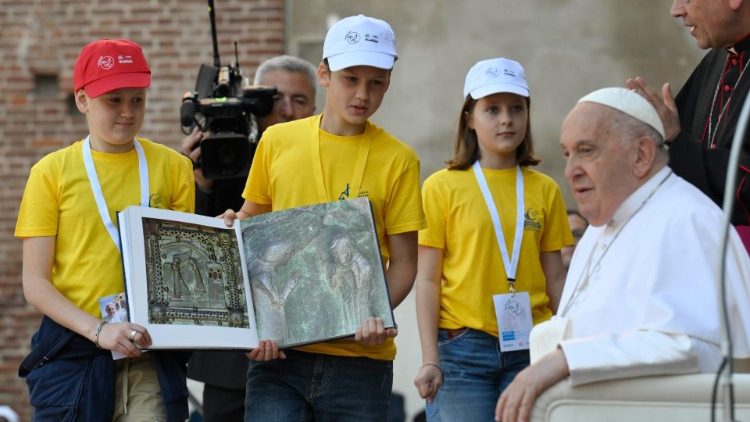 Na trgu pred baziliko svetega Zenona v Veroni je svetega očeta pričakala množica otrok in mladostnikov. Spodbudil jih je, naj pogumno hodijo proti toku in naj so znamenja miru v današnjem svetu, kjer je polno vojn.