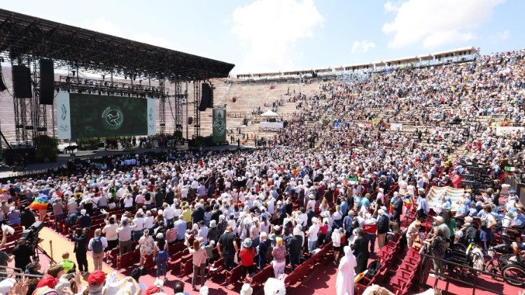 Poseben trenutek srečanja v veronski areni je bilo pričevanje Maoza Inona in Aziza Saraha. Maoz je prišel iz Izraela in 7. oktobra 2023 je Hamas ubil njegove starše. Aziz je prišel iz Palestine in izraelski vojaki so mu ubili brata. Oba sta podjetnika, ki verjameta, da je mir »najpomembnejša podjetniška poteza, ki jo je treba izpeljati«. Oba sta poudarila – objeta in z roko v roki –, da »mir ni mogoč brez ekonomije miru«. Kot je povedal papež, se ob takšnih izkušnjah »ne more veliko govoriti« ter zbrane povabil k trenutku tihe molitve za mir.