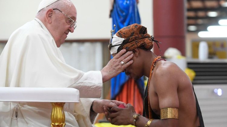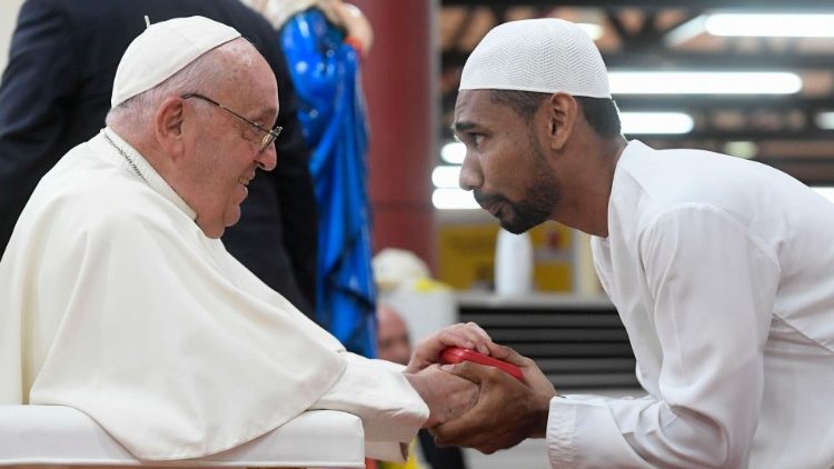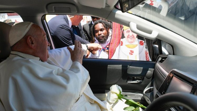 Mladi so svetega očeta ob prihodu pozdravljali z vzklikoma »Mi smo papeževa mladina!« ter »Živel, papež Frančišek!« Po plesu in pričevanjih je papež mlade pozdravil v njihovem jeziku – »Dadeer di’ak!« (Dober dan!) –, nato pa začel pogovor z njimi.