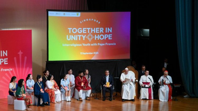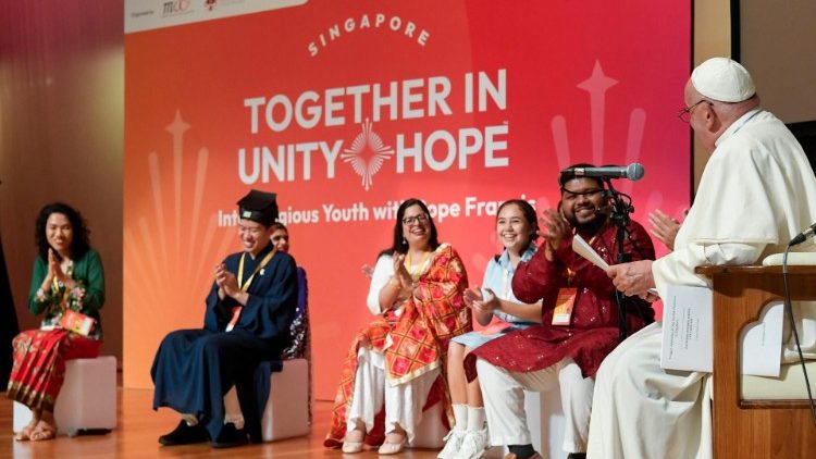 Srečanje z mladimi v Singapurju – potekalo je v petek, 13. septembra – je bilo medverske narave. Udeležili so se ga tudi predstavniki različnih verskih skupnosti. Svetega očeta so sprejeli z glasbo, petjem in plesom. Svoja življenjska pričevanja z vprašanji, namenjenimi papežu, so podelili trije mladi: rimokatoličanka Nicole, hinduist Raaj in mlada pripadnica sikhov Preet.