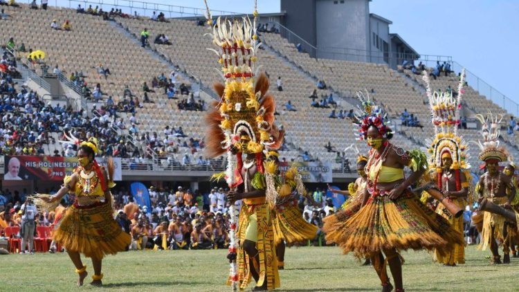 Vesel sem, da sem lahko te dni preživel v vaši deželi, kjer sobivajo morje, gore in tropski gozdovi; predvsem pa je to mlada dežela, v kateri živi veliko mladih! Vsi smo lahko občudovali mladi obraz te dežele, tudi prek lepe predstave, ki smo si jo ogledali tukaj. Hvala! Hvala za vaše veselje, za to, kako ste predstavili lepoto Papue, »kjer se ocean stika z nebom, kjer se rojevajo sanje in se pojavljajo izzivi«; predvsem pa hvala, ker ste vsem namenili pomembno željo: »Soočiti prihodnost z nasmehi upanja!« Z nasmehi veselja.