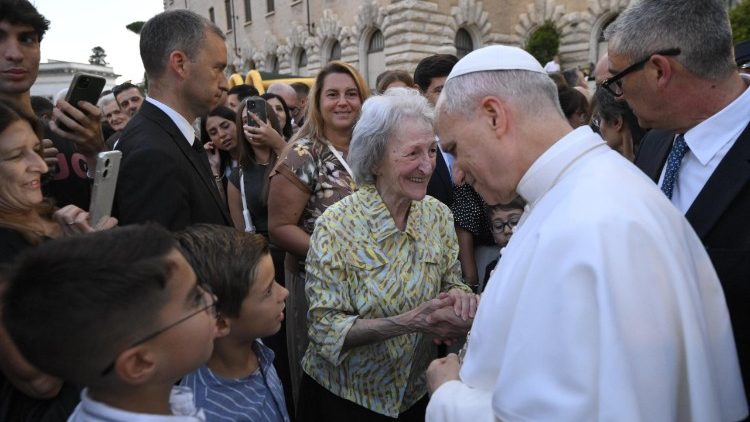 Zatem se je sveti oče približal zbrani množici in se še približno eno uro zadržal z otroki in njihovimi starši: sledili so objemi, blagoslovi, rokovanja, fotografiranja, pa tudi presenečenje v obliki pice, na kateri je bil napis »Živel papež Leon XIV.« Pred odhodom domov se je sveti oče fotografiral še z animatorji in žonglerji. Za vse udeležence je bil sobotni večer trenutek posebnega veselja: veselja, da so ena družina, skupaj s papežem.