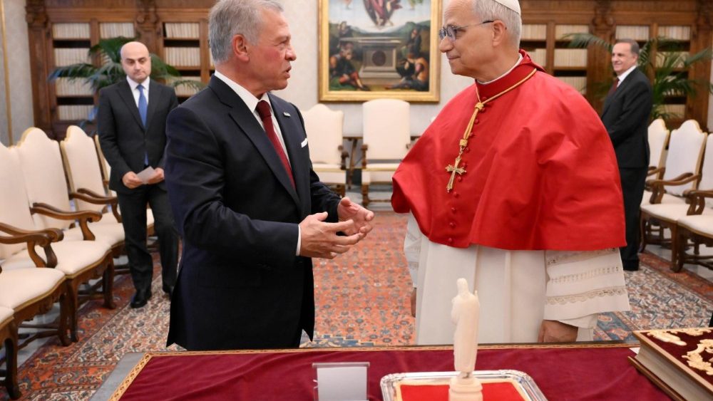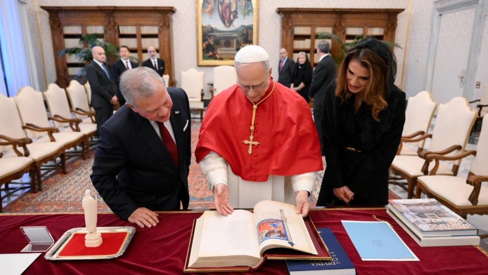 Sveti oče je v torek, 14. oktobra 2025, popoldan v knjižnici apostolske palače sprejel jordanskega kralja Abdulaha II. in kraljico Ranio. Po srečanju, ki je bilo zasebne narave, je kraljevi par papežu predstavil svoje spremstvo, nato pa je sledila izmenjava daril.