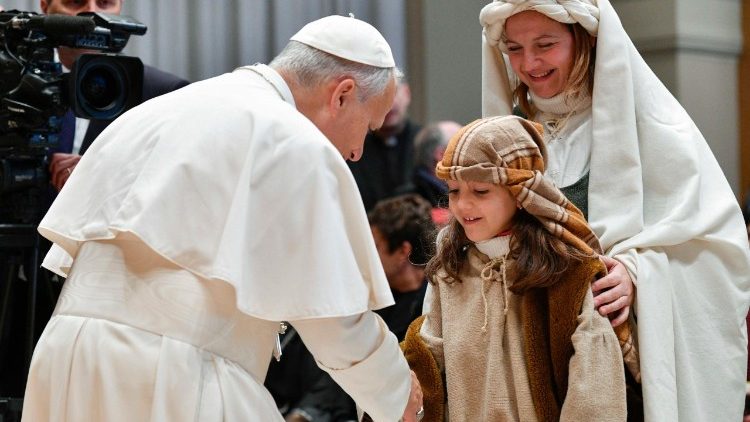 Jaslice, predragi, so pomembno znamenje: spominjajo nas, da smo del čudovite pustolovščine Zveličanja, v kateri nismo nikoli sami, ter, kot je dejal sveti Avguštin, da »je Bog postal človek, da bi človek postal Bog, […] da bi človek, ki prebiva na zemlji, našel bivališče v nebesih« (Sermo, 371,1). Širite to sporočilo in ohranjajte to tradicijo. Gre za dar luči za naš svet, ki tako zelo potrebuje upanje. Hvala, resnično hvala vsem za vaš trud! Iz srca blagoslavljam vas in vaše družine. Želim vam vesel blagoslovljen božič!